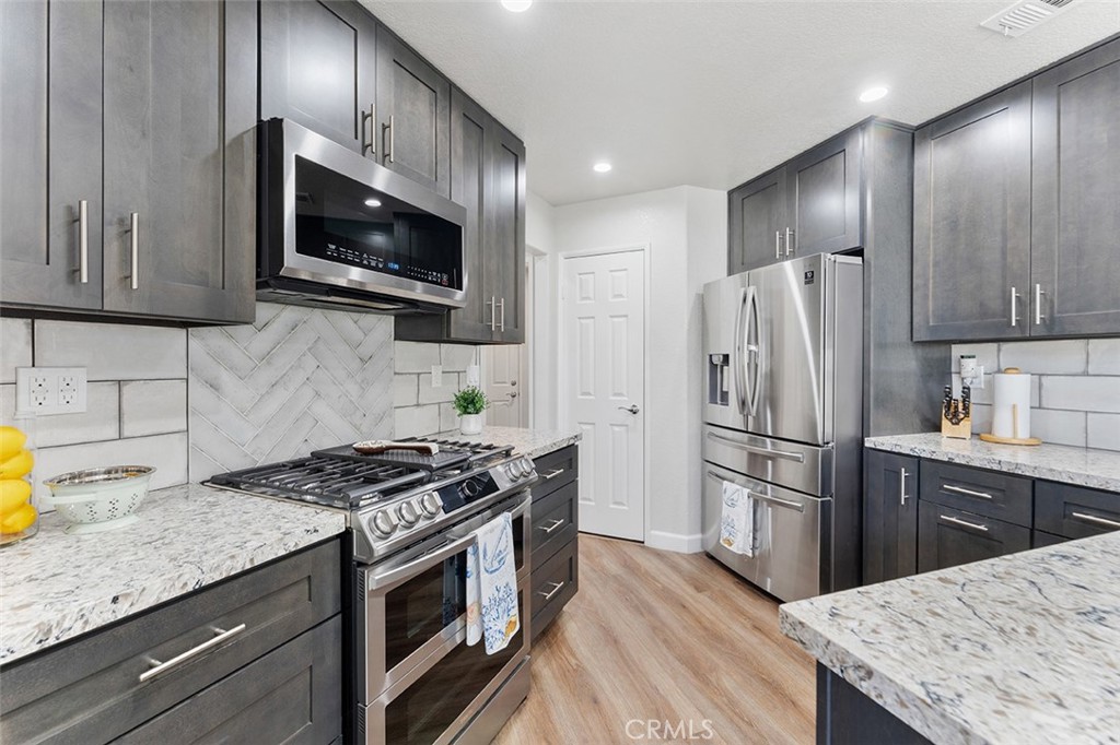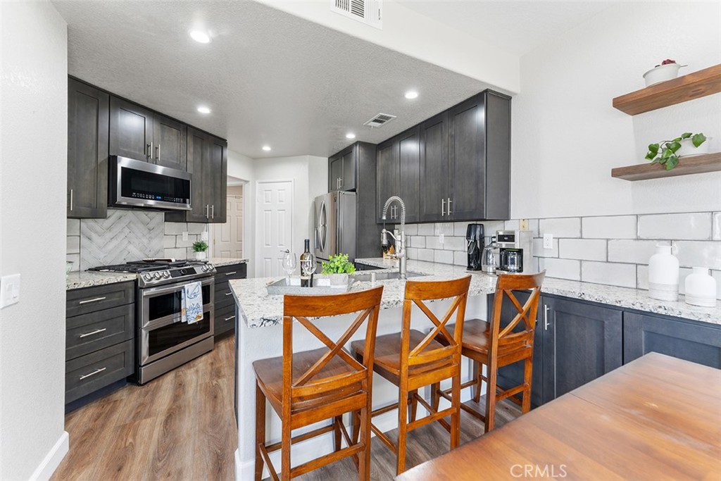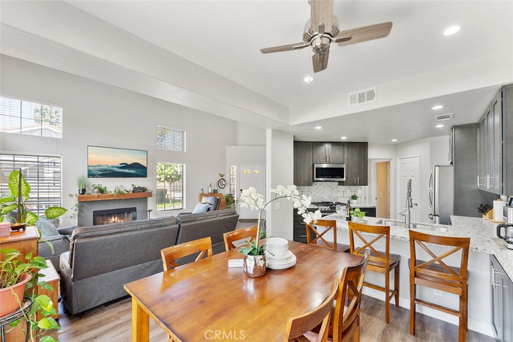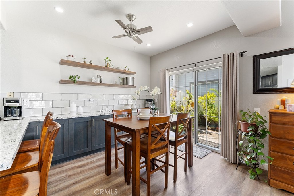 The contemporary touches include custom tile for the backsplash flowing perfectly into the dining area accented w/ wall to wall cabinets, quartz counter & floating shelves: Easier to store your kitchen & dining needs while displaying decor just so. From the dining are sliders to a generous size patio that can accommodate a BBQ, patio furniture & plants as you desire.