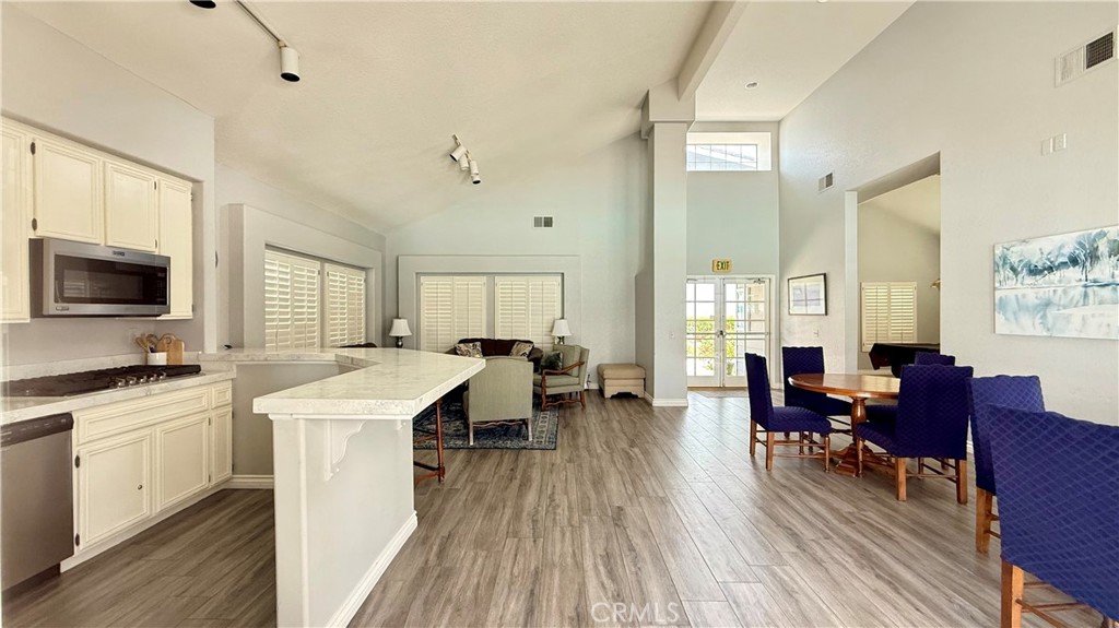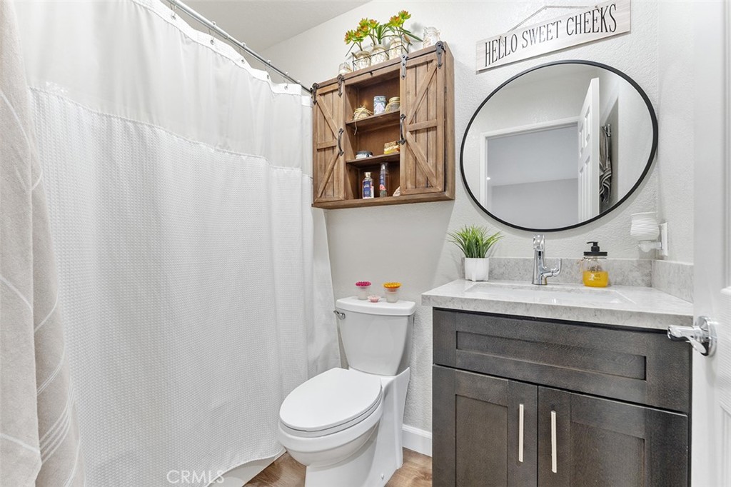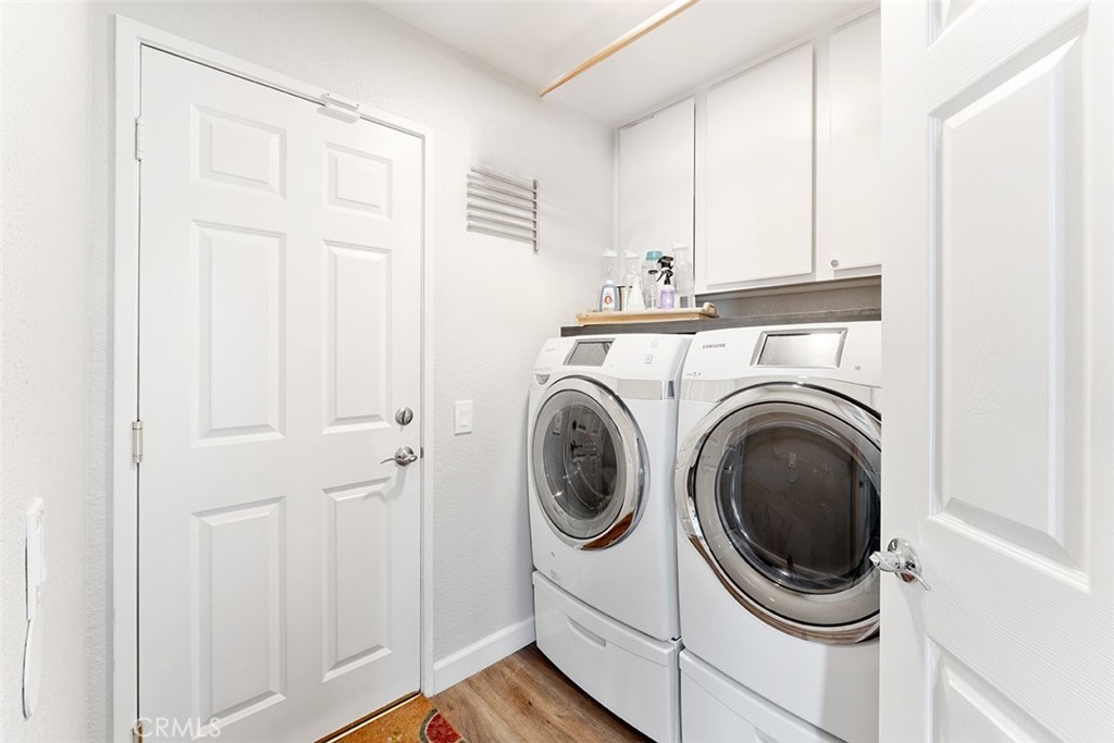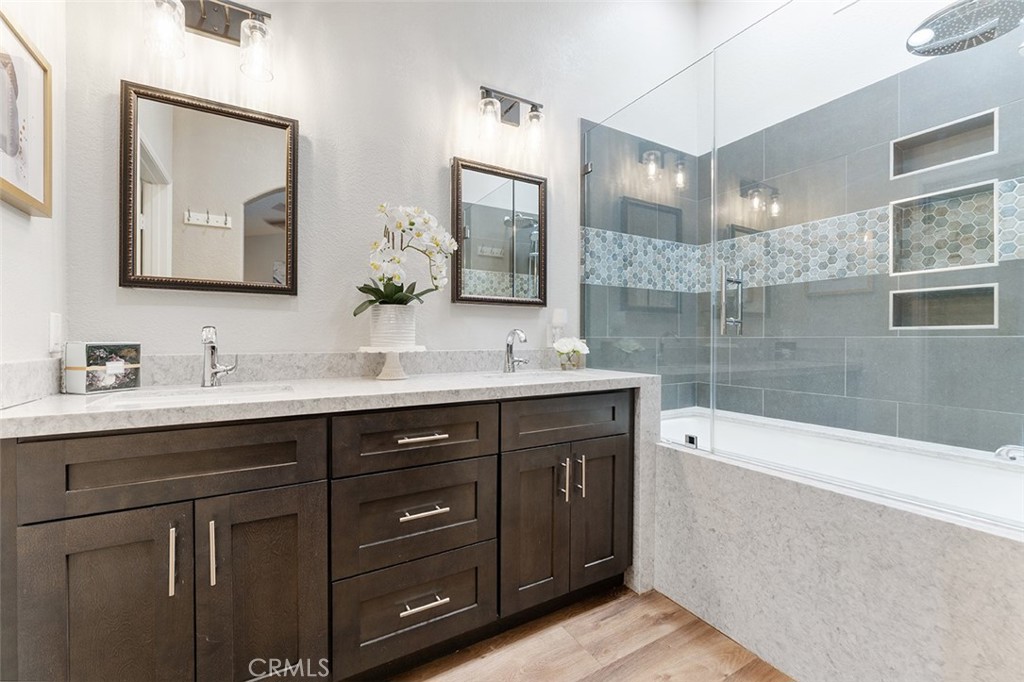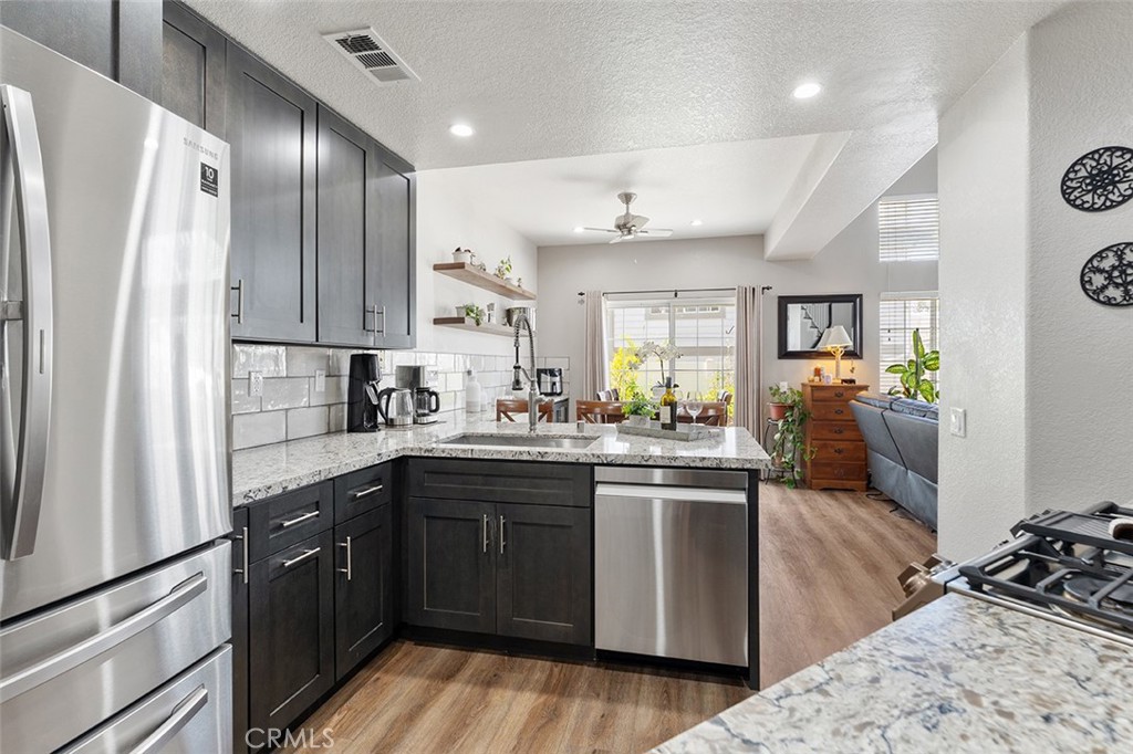 The contemporary touches include custom tile for the backsplash flowing perfectly into the dining area accented w/ wall to wall cabinets, quartz counter & floating shelves: Easier to store your kitchen & dining needs while displaying decor just so. From the dining are sliders to a generous size patio that can accommodate a BBQ, patio furniture & plants as you desire.