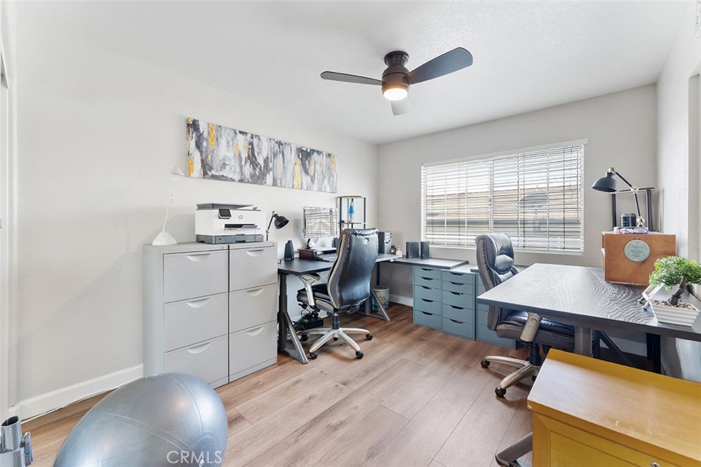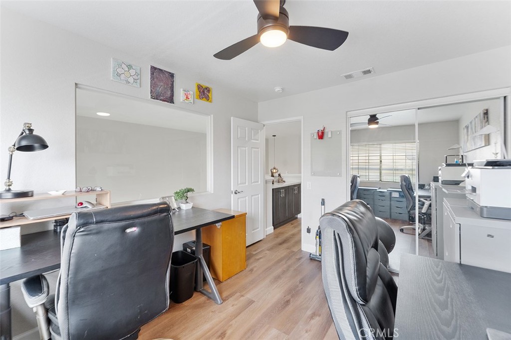 The second bedroom w/ a ceiling fan is currently used as an office. It has a window at one of the walls that looks toward the living area. One can put a curtain or blinds for more privacy if needed. The closet has mirrored doors.