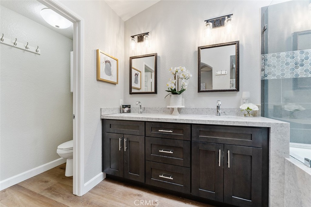 Get ready in the updated en suite w/ dual sinks, soaking tub, private commode & skylight.