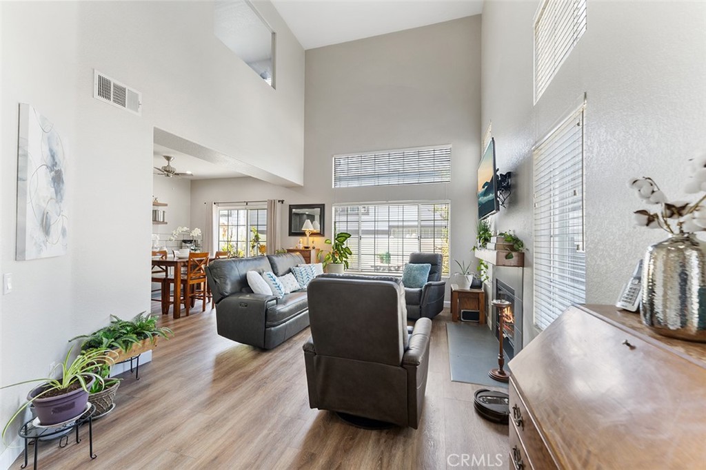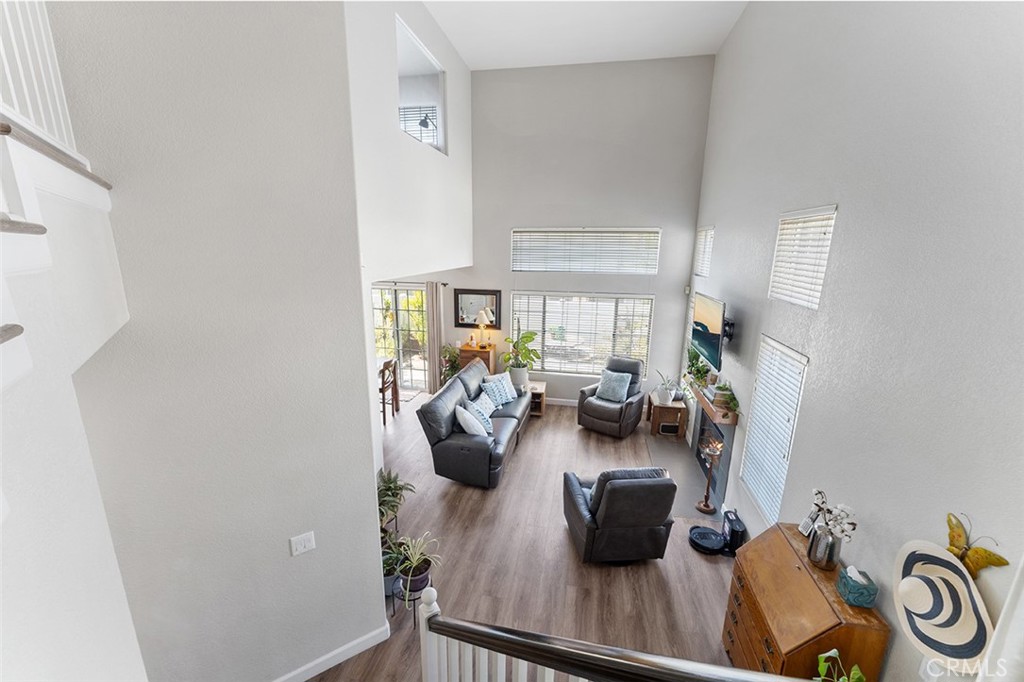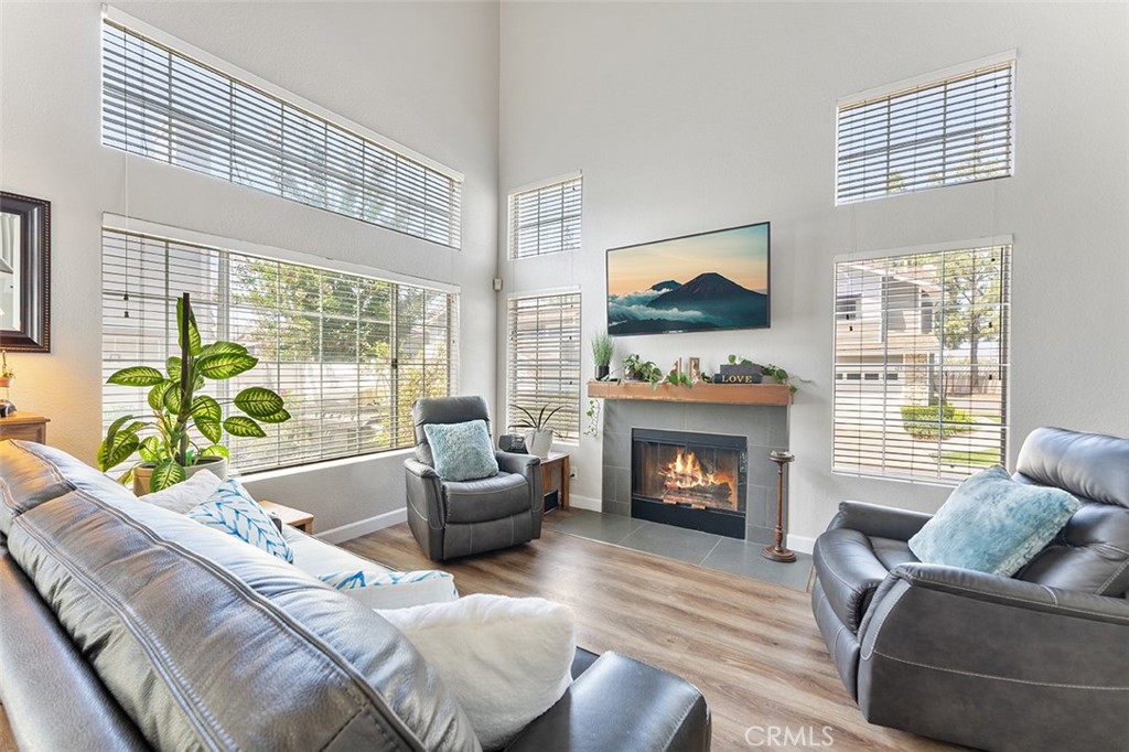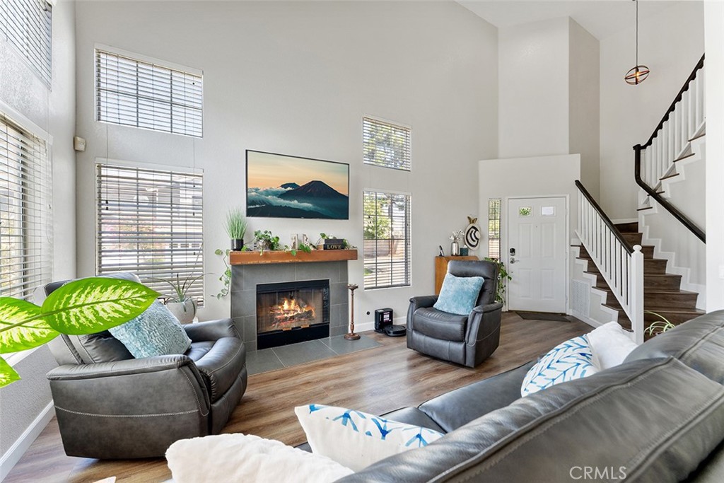 Guests can come through the front door that enters into the living room. One can appreciate the natural light that flows from the windows w/walls that are 2 stories high. Warm touches include the tile faced fireplace & beautiful beamed mantle. Renovations also include newer flooring throughout & the bathrooms & bedrooms.