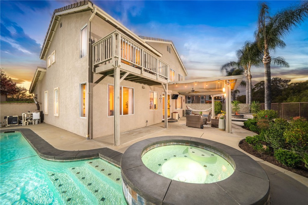 Nestled at the end of a quiet cul-de-sac, this stunning, fully remodeled home in Chino Hills offers everything your family needs. With 4 spacious bedrooms, 2.5 bathrooms, a private office, an upstairs loft, and 2,449 square feet of living space, this home provides both comfort and style. Situated on a private 6,480-square-foot lot, it features a gorgeous backyard w/ a covered patio, refreshing pool and spa, and lush landscaping -- perfect for entertaining or relaxing. As you approach, the charming front porch greets you, leading to the double-door entry. Inside, you'll find an open, airy floor plan w/ soaring high ceilings and an abundance of natural light. The inviting living room offers stunning pool views and beautiful hardwood floors. The adjoining dining area is perfectly positioned to take in views of the backyard. The expansive family room/great room is an entertainer's dream, featuring a cozy fireplace, built-in entertainment center, and sliding doors that open to the covered patio. The updated kitchen is a chef's delight, complete w/ white cabinetry, granite countertops, a large center island, and a built-in desk area. Additionally, the main floor includes a convenient powder room, a spacious laundry room, and direct access to the three-car attached garage. Upstairs, you'll find a bright office area, a cozy loft for extra relaxation space, and a beautifully remodeled primary suite w/walk-in closet and a private balcony w/serene backyard and hillside views. The luxurious primary bathroom features a dual-sink vanity w/quartz countertops, a soaking tub, a large shower, and tile floors. Three additional spacious bedrooms w/ mirrored closet doors and a remodeled hallway bathroom w/dual sinks, quartz counters, and a bathtub/shower combination complete the upper level. Step outside into your private entertainer's backyard, where you can unwind in the sparkling pool and spa, host guests around the fire pit, or enjoy California's perfect weather under the vinyl patio cover. With no rear neighbors, the backyard offers a peaceful, private retreat surrounded by professional hardscape and beautiful landscaping. This home also boasts a three-car garage, ample driveway parking, and is located just minutes from the Los Serranos Golf Course, top-rated schools, local parks, shopping, dining, numerous hiking trails and Chino Hills State Park. This is truly a one-of-a-kind property that combines modern luxury and comfort w/ exceptional privacy and convenience.